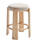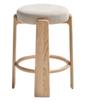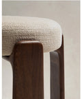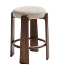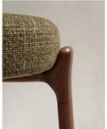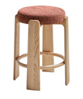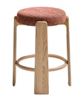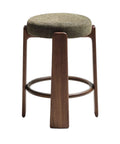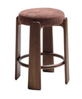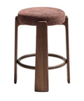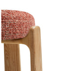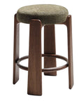 The Granite Counter Stool with no back is upholstered in thick, two-tone chenille and has solid ash wood legs in a walnut or natural timber finish. It has a medium seat firmness. Fabric made from recycled material and with a GRS certificate. Wood with FSC 100% chain-of-custody certification and sourced from a responsible forest management model.