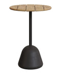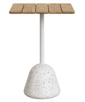 The Saura Bar Table combines natural warmth with contemporary form. Available with a rounded concrete and steel base in Black paired with a solid acacia wood top in a rich walnut or natural finish measuring 700mm Round or with a rounded concrete and steel base in white Terrazzo paired with a solid acacia wood top in a natural finish measuring 700mm x 700mm Square