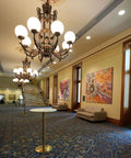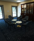 Coffee tables with brass bases and Calcutta Grey compact laminate tops, as well as bar tables featuring Carlita bases and matching Calcutta Grey tops, enhance the communal zones without overwhelming the existing architectural features. Each furniture piece was curated to sit respectfully within the historical setting, allowing original finishes and detailing to remain the visual hero.