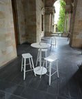On the balcony, White Coleman Bar Stools paired with white Luna bases and Calcutta Grey table tops provide a fresh and cohesive outdoor setting that mirrors the sophisticated interior.
