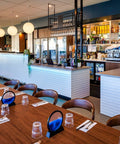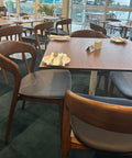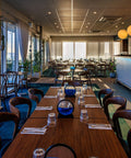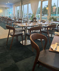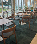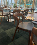 The restaurant boasts an inviting and elegant ambiance, both inside and out. Inside, guests can relax in comfort on Idalia Chairs or classic Bentwood Chairs in Walnut, paired with custom table tops in luxurious Florentine Walnut Woodmatt.