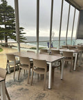 Outside, the dining experience is elevated with Henley table frames in white featuring custom Natural Walnut compact laminate tops, complemented by stylish Sorrento Chairs in Khaki. Whether dining indoors or alfresco, every detail is designed to enhance your experience.