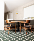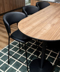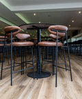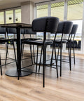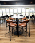 Eamy Side Chairs and Kingston Armchairs are paired with Nataio Walnut compact laminate table tops and Carlton table bases, creating inviting dining areas. Bourbon Bar Stools with Roman Ceppo compact laminate tops and Carlton bases, along with shaped Nataio Walnut bar tops with Carlton bases and Como black upholstered bar stools, provide elevated seating options for those seeking a more social experience.