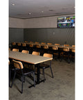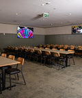 The function area features Melamine Tasmanian Oak Table Tops on folding bases, along with stackable Caprice Chairs to ensure flexibility in both usage and storage. Meanwhile, the TAB showcases Tasmanian Oak Melamine Table Tops with Henley Bar Bases accompanied by Caprice Counter Stools.