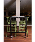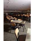 In the dining and bar spaces, you’ll find Caprice Natural Bar Stools paired with Tasmanian Oak Melamine tops and Carlton Cast Iron Bar Bases. Caprice Dining Chairs, complemented by Melamine Table Tops in Topiary and supported by Gibson bases in various sizes, provide versatile seating options.