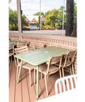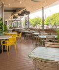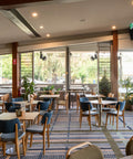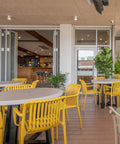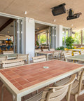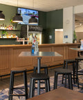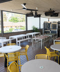 The beer garden invites relaxation with Olive Green Bordeaux tables and Spotted Gum slatted tops on Carlton bases powder-coated in Evening Haze satin finish. Gorgeous tiled tables with Perini tiles in Rust and Grass with frames powder coated in Evening Haze complete the space. Seating includes Helen Chairs in Taupe by Siesta, Nobu Backless Stools in Charcoal, and Nobu Stools in Olive Green, offering a stylish outdoor vibe.