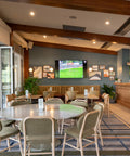 In the sports bar, find Nala Table Bases with laminate tops in Habitat with walnut edges, along with Henley bar and dining frames featuring Walnut Elm tops in square, rectangle, and round designs, creating a versatile and polished space for watching the game or gathering with friends.