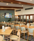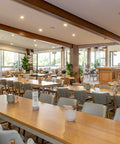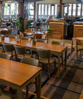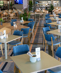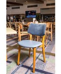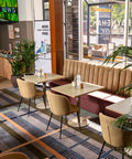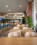 In the bistro, a stunning 1800mm diameter Corian feature table takes center stage, complementing melamine table tops in Olivine with Oak edges and natural Elm tops, paired with Carlton and Henley bases powder-coated in Dulux Dove. Seating includes Vinnix Chairs and Dan Chairs upholstered in a range of complementary fabrics, custom fluted booth seating with Designtex Velvet Corduroy Dutch Blue backs and seats in Skai Pureto En Merlot.