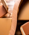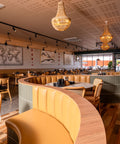 The interior features Sienna Chairs in natural, paired with round compact laminate table tops in Calcutta Grey, and stunning custom-upholstered booth seating weaving through out the space to create a cosy yet refined dining experience.
